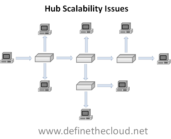 Once multiple hubs are connected and the network grows each hub will flood every frame, and all devices will receive these frames regardless of whether they are the intended recipient. This causes major overhead in the network due to the unneeded frames consuming bandwidth.